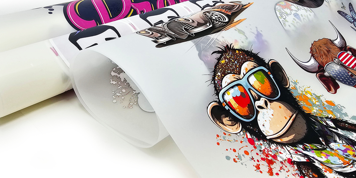 Full-colour transfers printed on film and heat-pressed onto fabric. Works on cotton, polyester, leather and more. Vibrant, durable and washable.